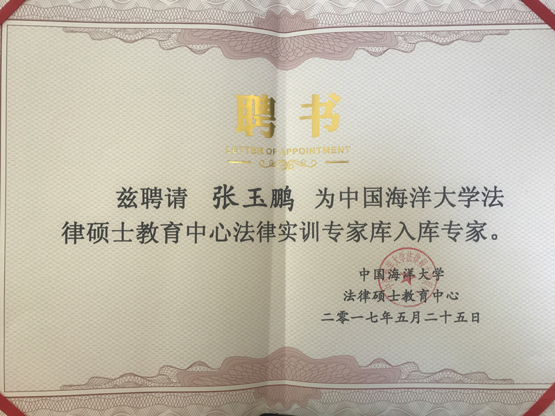 我所张玉鹏主任被聘为中国海洋大学法律硕士教育中心法律实训专家库入库专家。