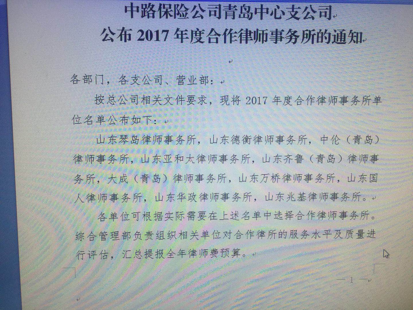 祝贺我所入选中路保险公司青岛中心支公司2017年度合作律师事务所