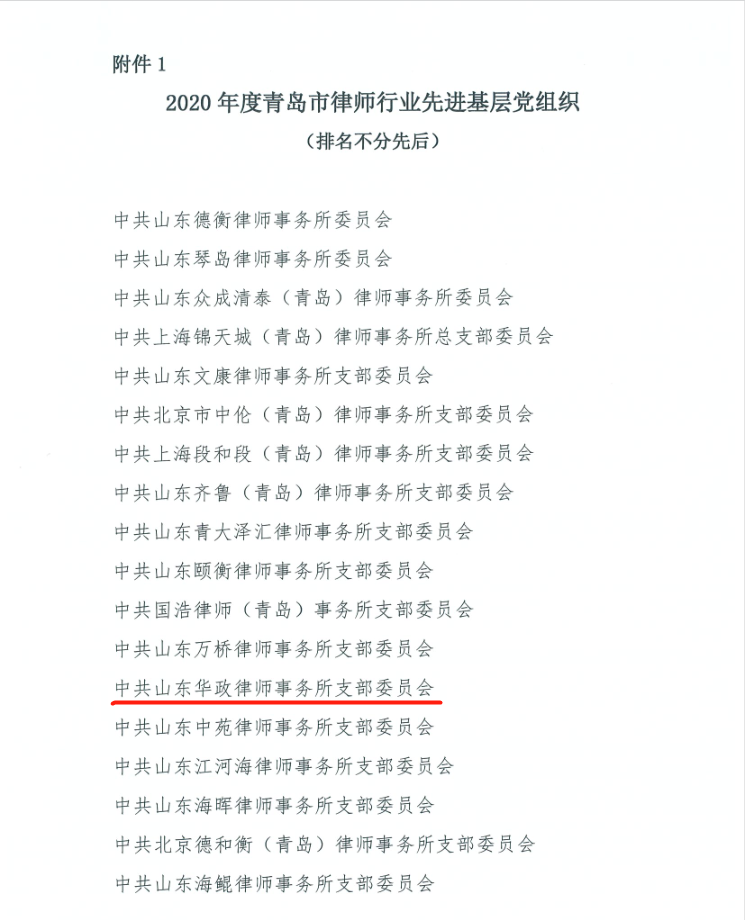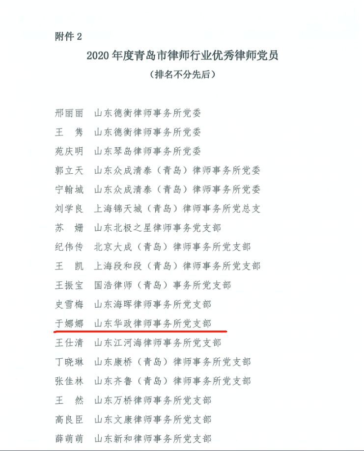2020年7月8日,中共青岛市律师行业委员会下发了《关于表彰2020年度青岛市律师行业先进基层党组织 优秀党员和优秀党务工作者的决定》【青律党字﹝2020﹞12号】,对山东华政律师事务所党支部及山东华政律师事务所于娜娜律师进行了表彰,授予山东华政律师事务所党支部“青岛市律师行业先进基层党组织”,授予于娜娜律师“青岛市律师行业优秀律师党员”荣誉称号。