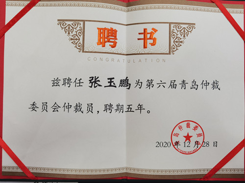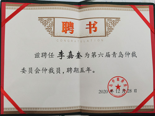 近日,经过严格筛选和考核,青岛仲裁委员会完成第六届仲裁员遴选工作,并为新聘仲裁员颁发聘书,山东华政律师事务所李嘉奎主任、张玉鹏主任获聘为青岛仲裁委员会仲裁员。