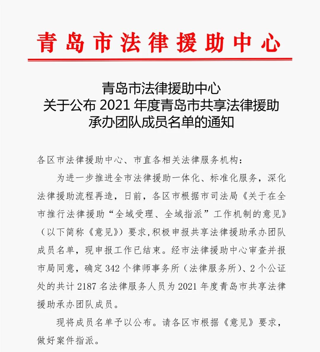近日,为进一步推进全市法律援助一体化、标准化服务,深化法律援助流程再造,山东华政律师事务所积极参与全市推行法律援助“全域受理、全域指派”工作,经青岛市法律援助中心审查并报青岛市司法局同意,确定山东华政律师事务所为青岛市首批法律援助受理点,其中山东华政律师事务所多名律师为2021年度青岛市共享法律援助承办团队成员。华政律师在努力提升专业水平、强化业务能力的同时,不忘社会责任,努力在法律援助方面贡献自己的力量。