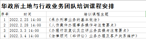 为更好地为客户提供专业化、综合性、一站式的法律服务,华政所土地与行政业务团队将在未来一个月内集中开展相关业务领域培训活动。具体安排如下: