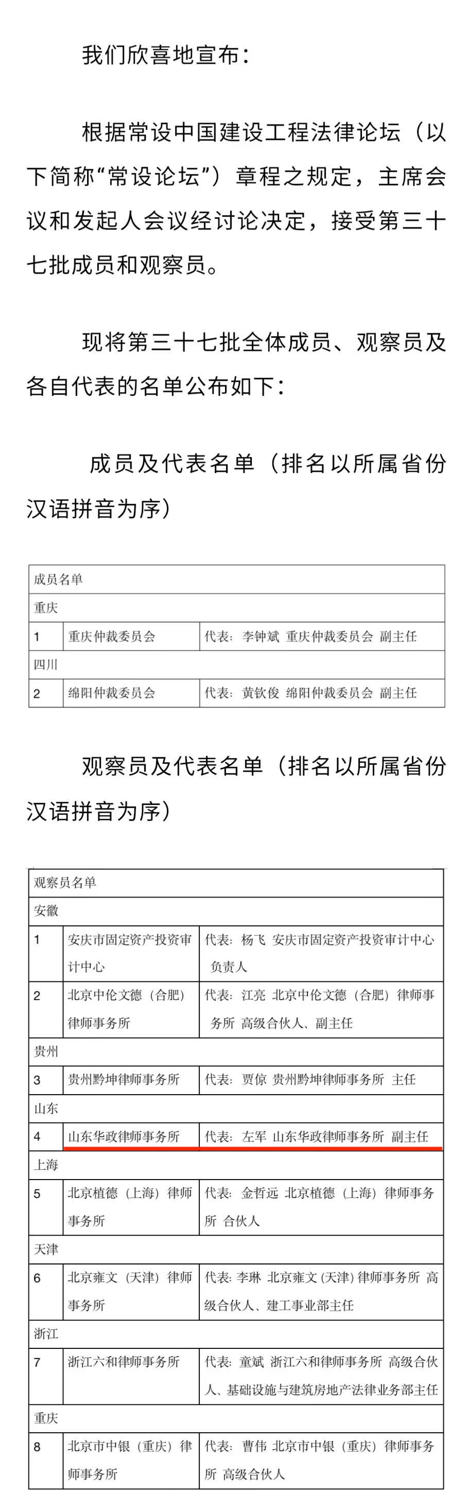 根据常设中国建设工程法律论坛章程之规定,主席会议和发起人会议经讨论决定接受第三十七批成员和观察员,山东华政律师事务所被接受为观察员,我所副主任、基础设施和工程总承包部主任左军律师为观察员代表。常设中国建设工程法律论坛由最高人民法院中国应用法学研究所、中国国际经济贸易仲裁委员会、北京仲裁委员会、深圳仲裁委员会、石家庄仲裁委员会、广州仲裁委员会、上海仲裁委员会、上海国际经济贸易仲裁委员会(上海国际仲裁中心)和宁波仲裁委员会共同发起设立。