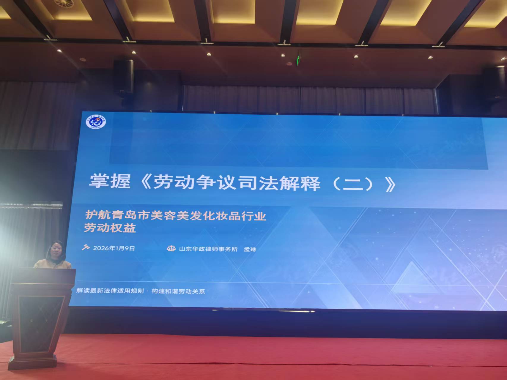 为助力青岛市美容美发化妆品行业规范用工管理,有效防范劳动争议风险,2026年1月9日,由青岛市司法局指导、青岛市美容美发化妆品行业协会主办的《劳动争议司法解释(二)》专题宣讲活动在崂山区海尔路17号3号会议室顺利举办。山东华政律师事务所孟琳律师作为青岛市惠企律师,受邀担任本次宣讲主讲人,为行业企业带来专业的法律指导。