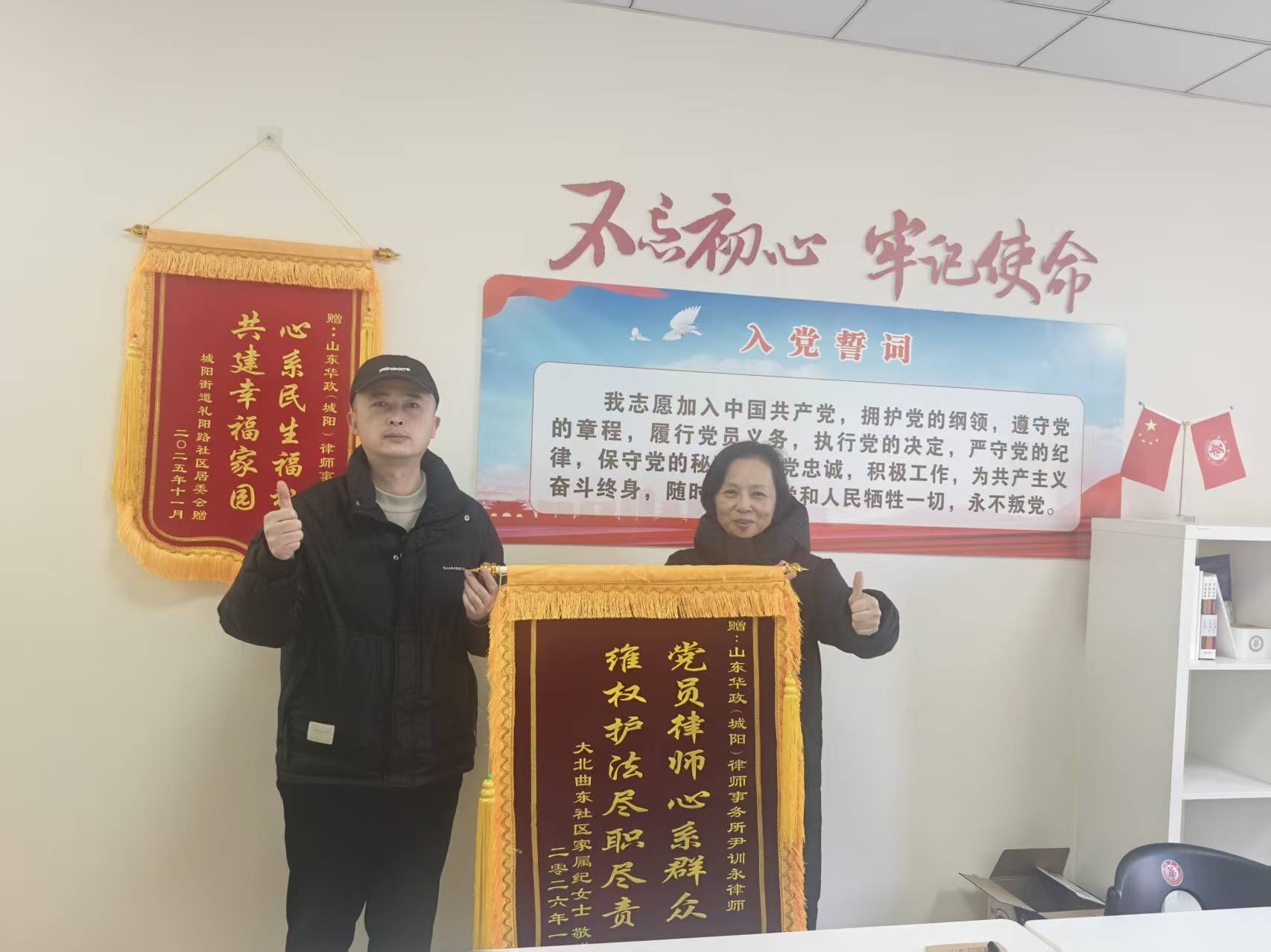 2026年1月30日下午,山东华政(城阳)律师事务所迎来温暖一幕。城阳区某物业公司纪经理专程送来锦旗,上书“党员律师心系群众,维权护法尽职尽责”,向尹训永律师表达由衷感谢与高度认可。锦旗不仅是荣誉,更是责任。这十六个字,既是对尹律师多年执业、为民解忧的肯定,也彰显了党员律师“以人民为中心”的初心使命。